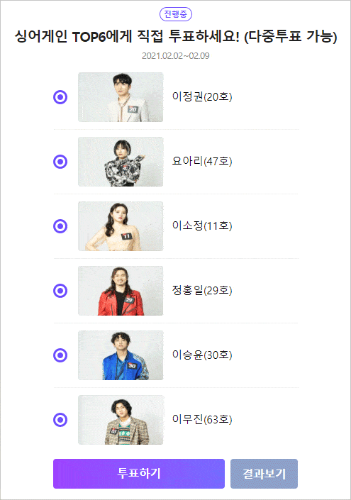 다중투표도 허용하고 있어서 응원하고 있는 사람이 여러 명이라면 모두 투표가 가능합니다.